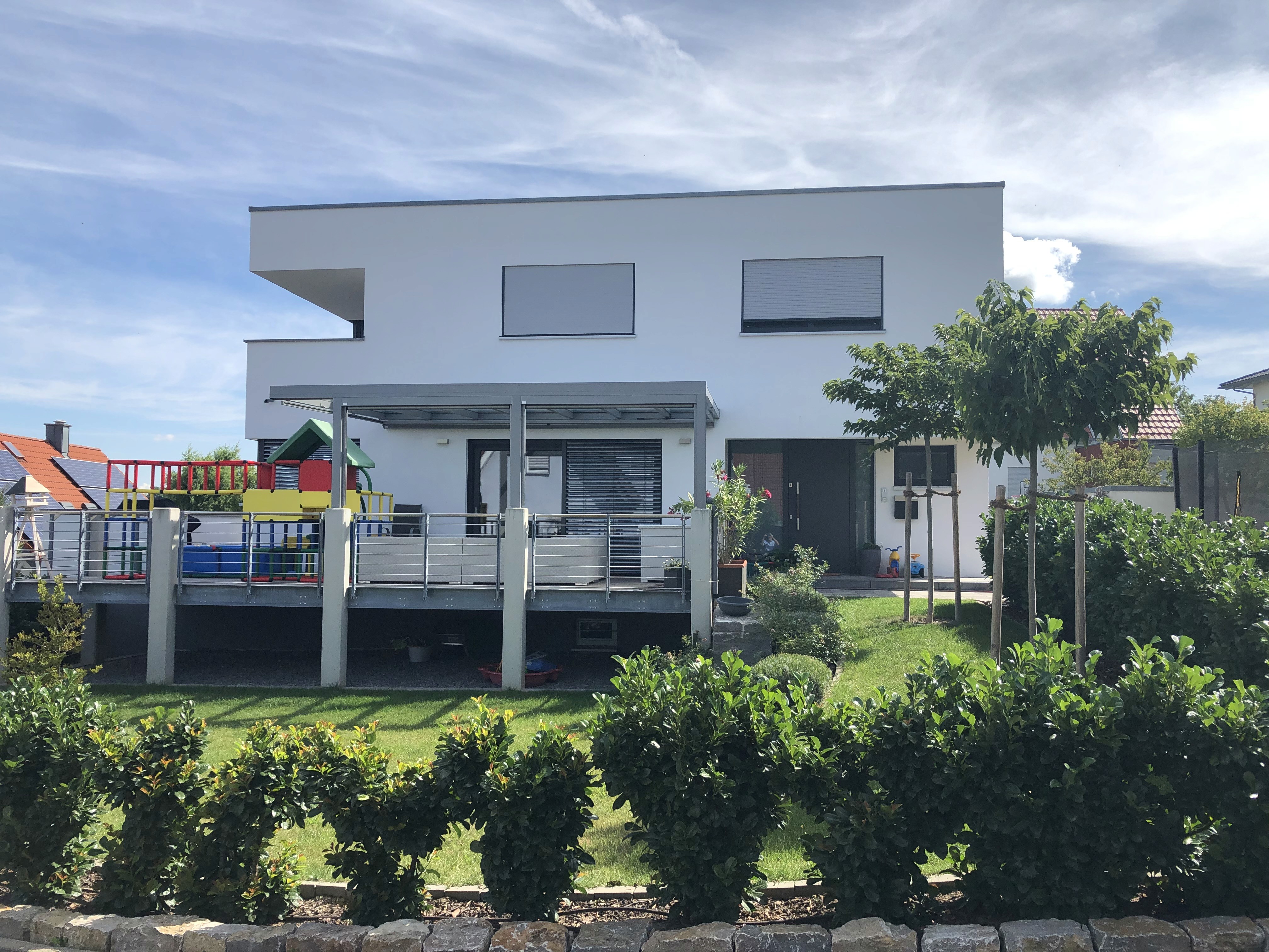 In der Gemeinde Hettstadt bei Würzburg wurde auf einem lange unbebauten Grundstück ein modernes Einfamilienhaus im Bauhausstil geplant und realisiert. Das Gebäude befindet sich innerhalb eines bestehenden Wohngebiets und fügt sich selbstverständlich in die gewachsene Struktur ein. Gleichzeitig setzt der Neubau ein eigenständiges architektonisches Zeichen durch seine klare Kubatur und reduzierte Formensprache.